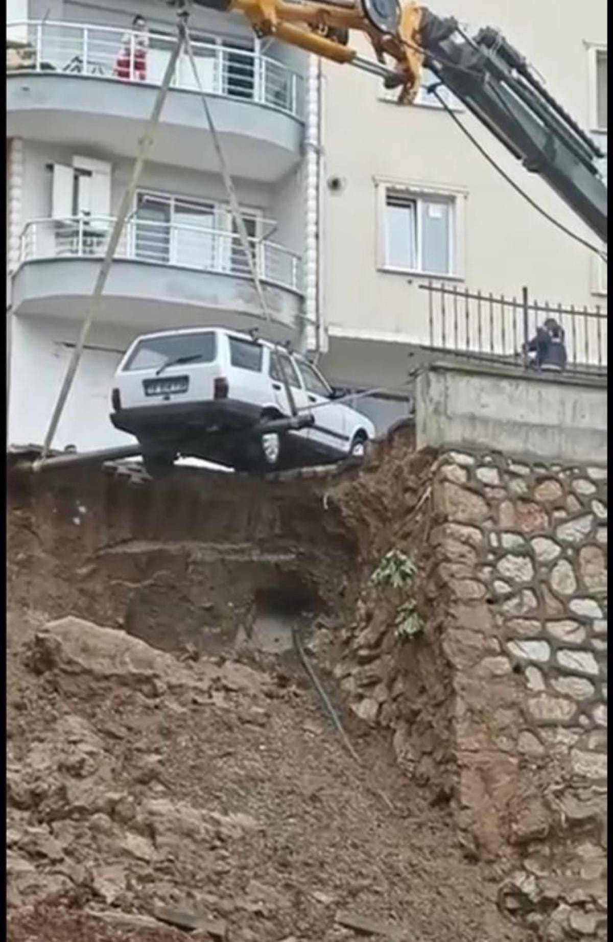 Duvarın enkazı, binada aynı kattaki 2 dairenin yan duvarlarına devrildi. Otoparktaki bir otomobil de enkaz altında kaldı.