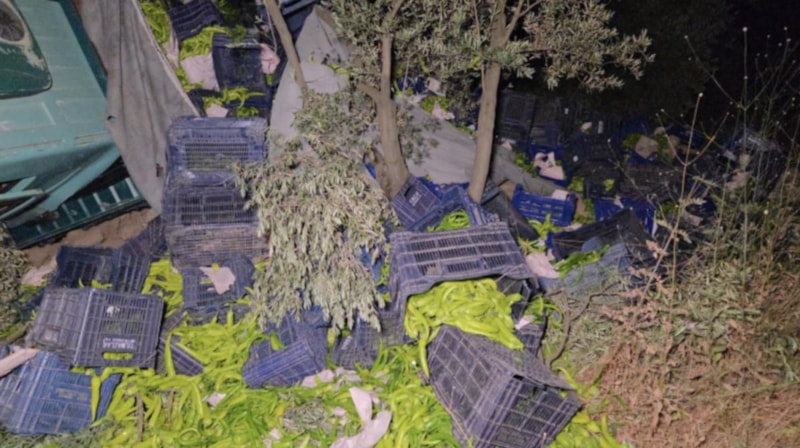 Kamyondaki yaklaşık 10 ton biber ise zeytinlik alana dağıldı.