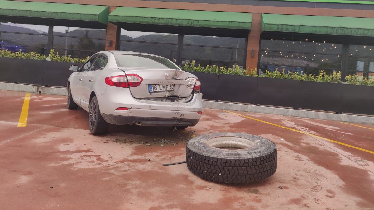 Hızla ilerleyen tekerlek, restoran önünde park halindeki Aykut Sezgin'in otomobiline çarptı. Çarpmanın şiddetiyle otomobilin bagajında hasar oluştu.