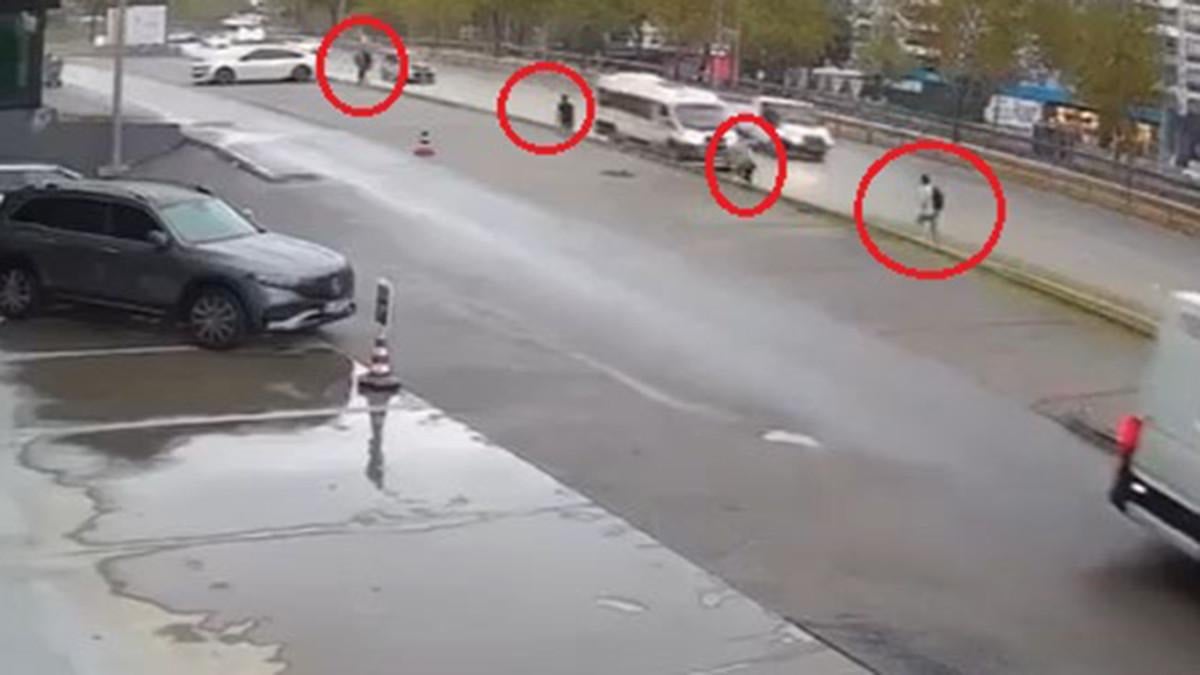 Sürücünün son andaki manevrası ile olası facia önlenirken yayaların panik yaşadığı anlar güvenlik kamerasına yansıdı.