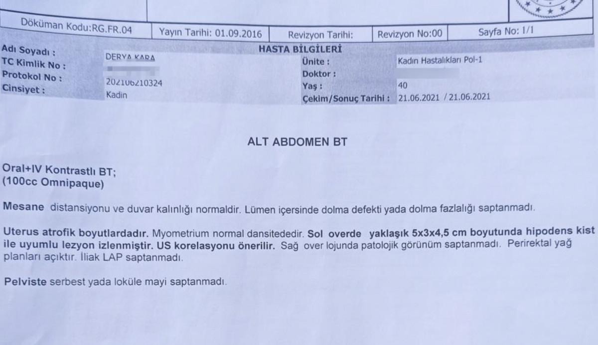 Bursa’da karın ağrısı şikayetiyle 6 Mayıs 2021 tarihinde Osmangazi Aritmi Hastanesi'ne giden 41 yaşındaki Derya Kara, kadın doğum uzmanı tarafından muayene edildi.