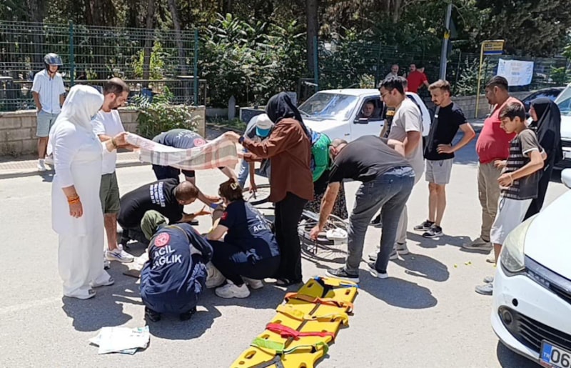 İnegöl’de otomobilin çarptığı bisiklet sürücüsü yaralandı. Yardıma koşan vatandaşlar, yaralıyı güneşten korumak için üzerine örtü tuttu.