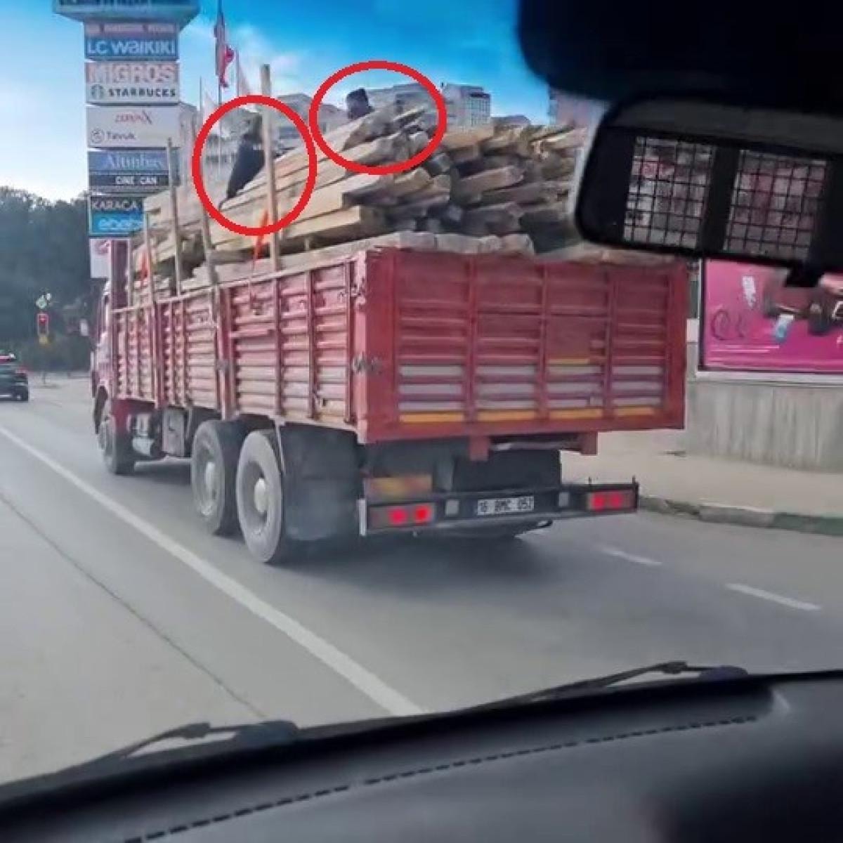 Ağzına kadar dolu kasanın üzerinde sallanan kerestelerin arasında 2 gencin yolculuk yaptığı görüldü.