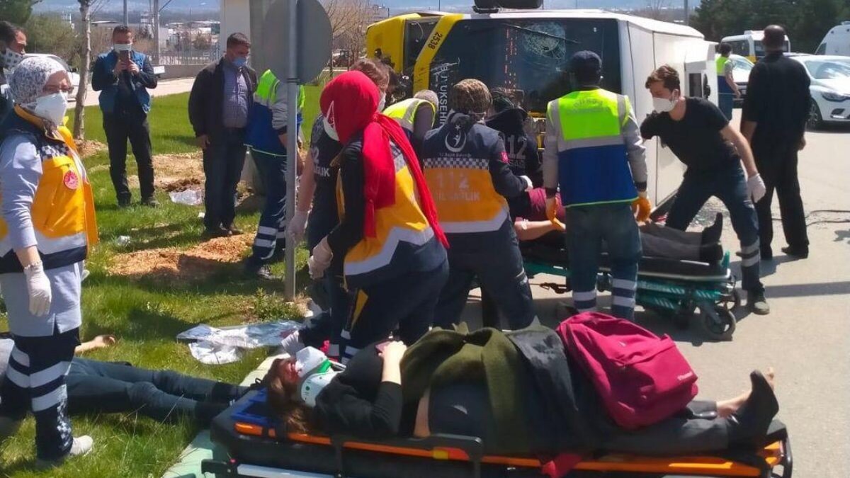 Bursa'nın Nilüfer ilçesinde, Bursa-İzmir yolunun Uludağ Üniversitesi kavşağında seyreden yolcu midibüsü, kontrolden çıkıp, direğe çarparak devrildi.