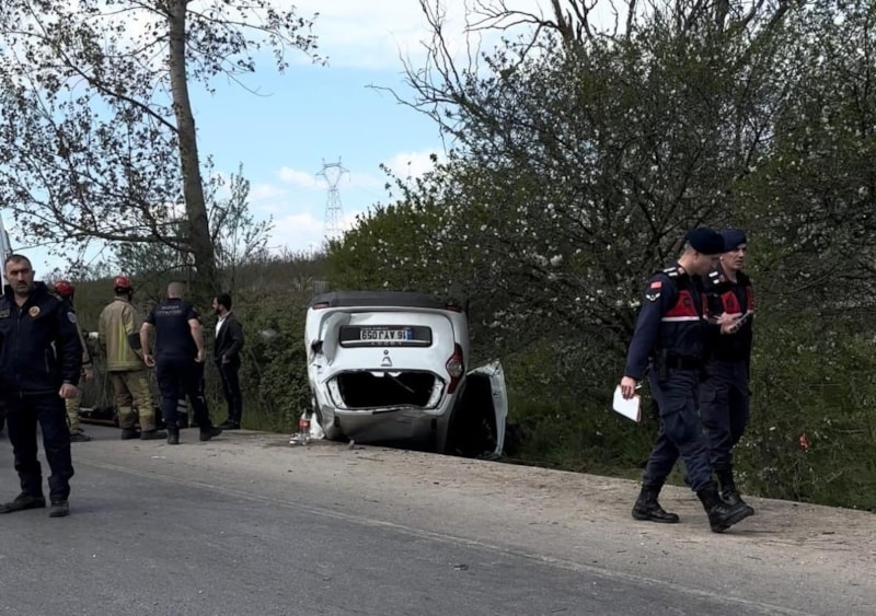 Takla atan otomobil, yol kenarındaki yağmur suyu kanalına düşüp ters döndü.