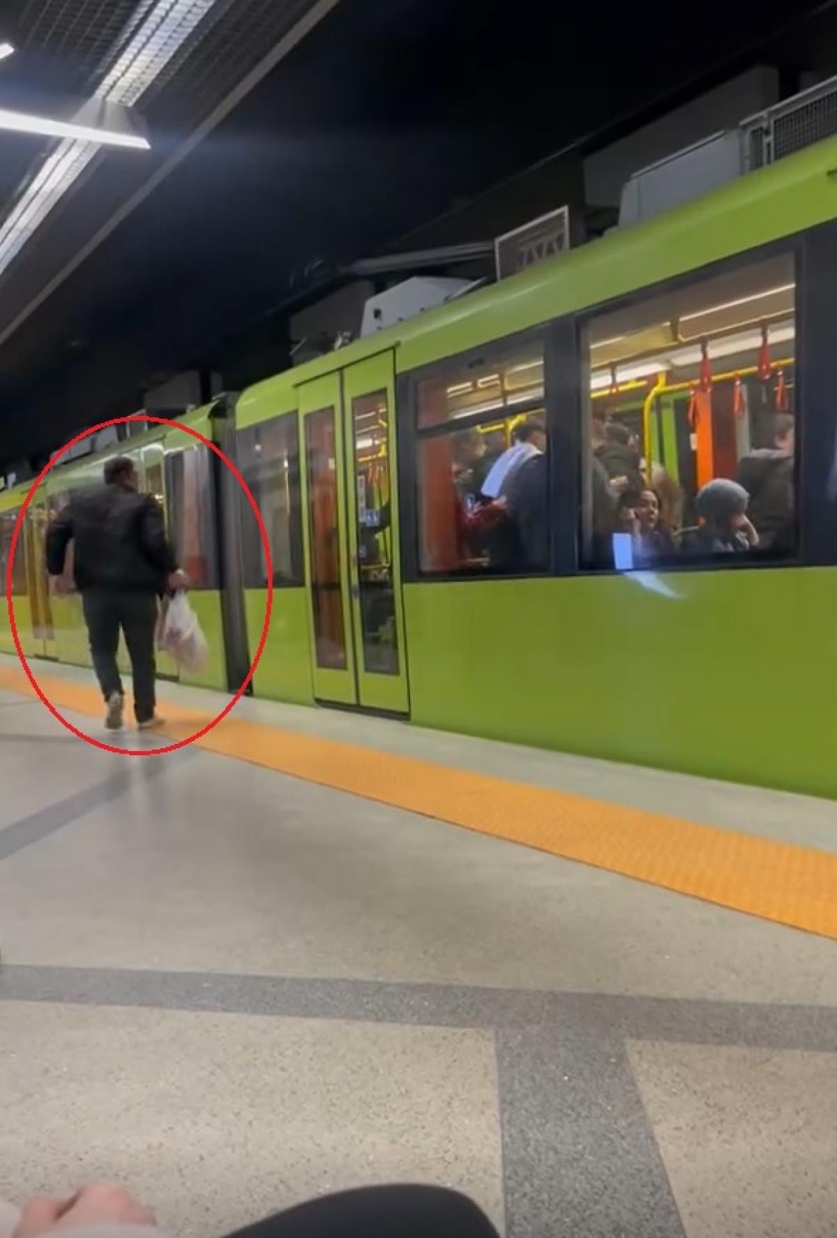 Görüntülerde, metronun içinde darbedilen yolcunun, vagonun kapıları açıldığında, diğer yolcular tarafından tekmelenerek dışarı atıldığı, elindeki poşetlerin de yere düştüğü görüldü.