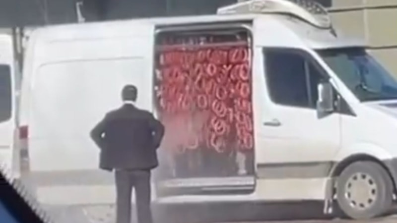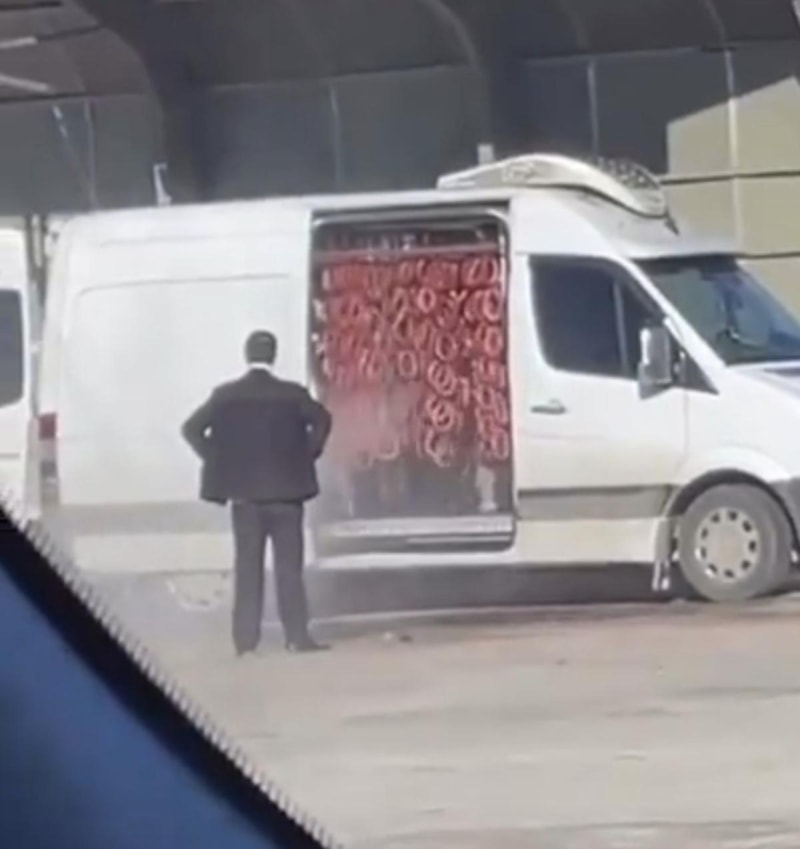 Bir akaryakıt istasyonunun oto yıkama alanında bulunan bir minibüsün yan kapısını açan şahıslar buradan içeride bulunan sucukların üzerine su püskürterek sucukları yıkadı.