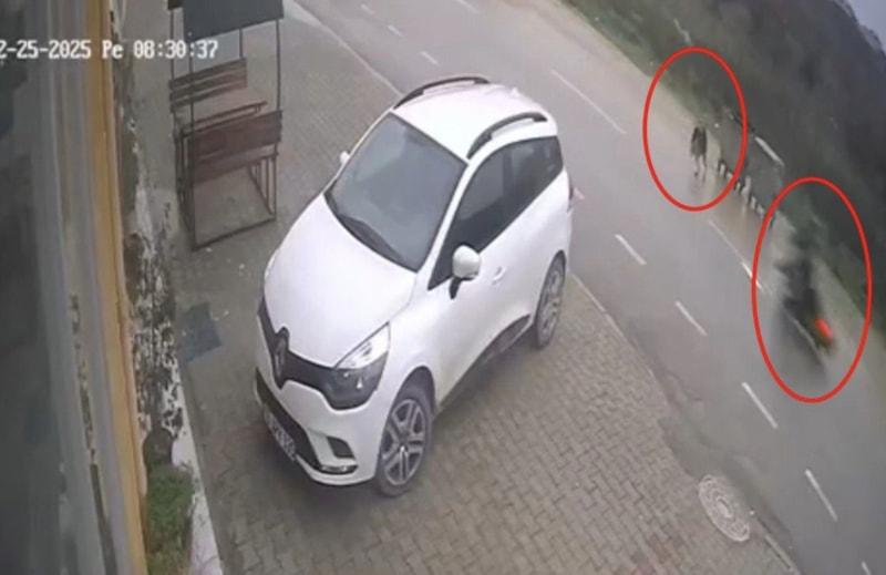 Görüntülerde, moto kuryenin devrilen motosikletten savrulup yere düştüğü, kendisini takip eden köpeğin ise kazanın ardından geri çekildiği görüldü.