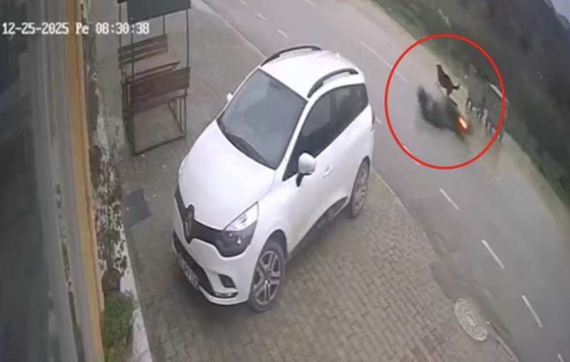 Nilüfer ilçesinde kendisine saldıran sokak köpeğinden kaçarken devrilen motosikletin 25 yaşındaki sürücüsü moto kurye Emrah S. yaralandı. O anlar, bir iş yerinin güvenlik kamerasına yansıdı.