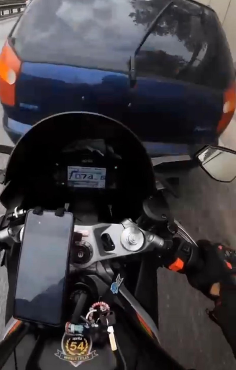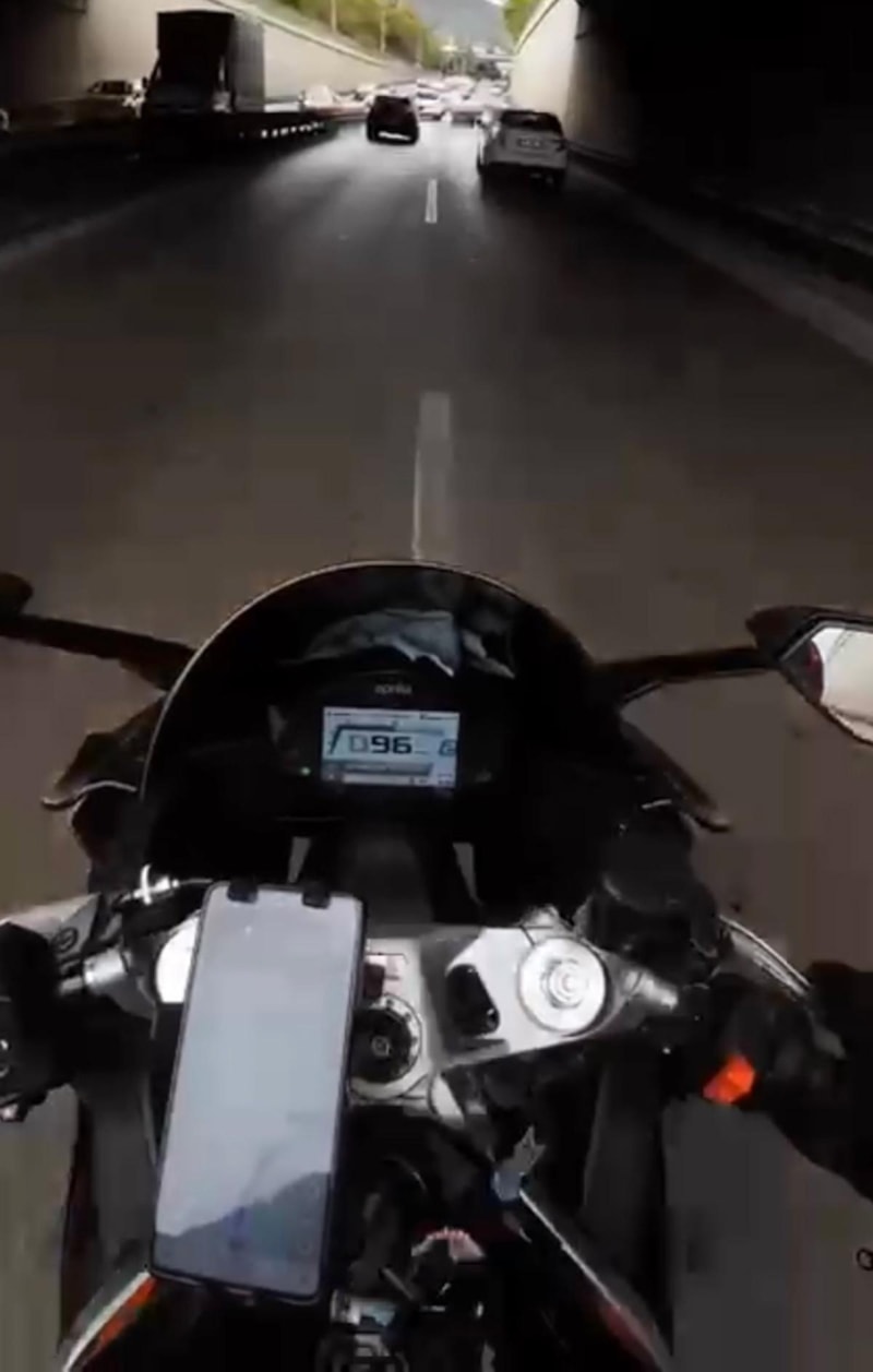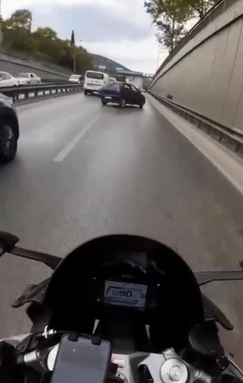 Kask kamerasına yansıyan görüntülerde otomobilin ani manevrası ve çarpışma anı net bir şekilde görüldü.