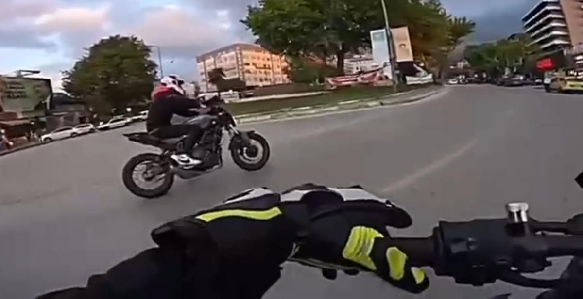 Kırmızı ışıkta duran araçları sollayan motosikletlilerin, hız kesmeden ön tekerlerini kaldırıp tek teker üzerinde metrelerce ilerlediği anlar görüntüye yansıdı.