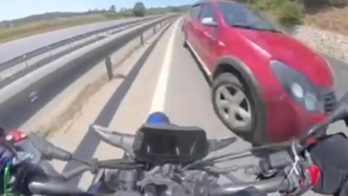 Ters yönde ilerleyen otomobil sürücüsüne tepki gösteren motosikletli, görüntüleri sosyal medyada paylaşarak duruma dikkat çekti.