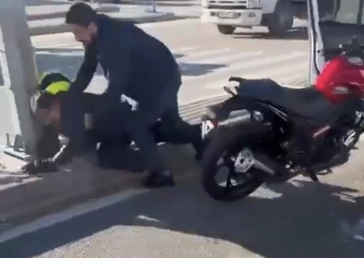 Tartışmanın büyümesiyle otomobil sürücüsü kaskını aldığı motosiklet sürücüsüne kaskla vurmaya başladı.