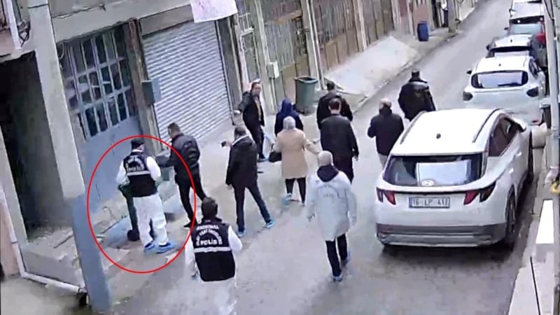 3 çocuk annesi kadın beraberindeki savcı ve polislerle birlikte yer gösterme yapıp olayı anlatırken o anlar, çevredeki bir evin güvenlik kamerasına yansıdı.