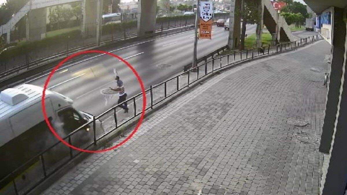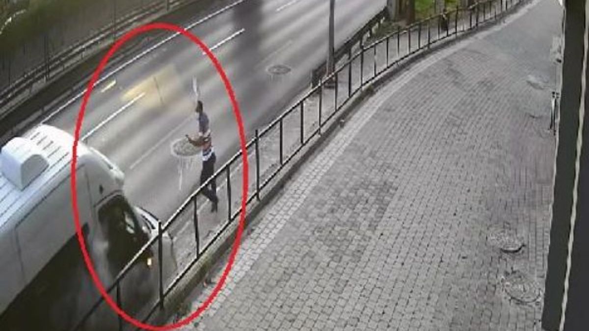 Özyıldız trafikte ilerleyen araçların arasında kalıp ölümden dönerken, minibüs kaldırıma çıkarak tabela ile bariyere çarptı. Kaza yapan minibüsün sürücüsü, aracından inerek yerde yatan adamın yanına geldi.