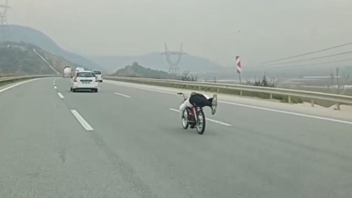 Bursa-İzmir Otobanı Mudanya girişi yakınlarında kimliği bilinmeyen sürücü, motosikletinin üzerine yatarak 130 kilometre hız yaptı.