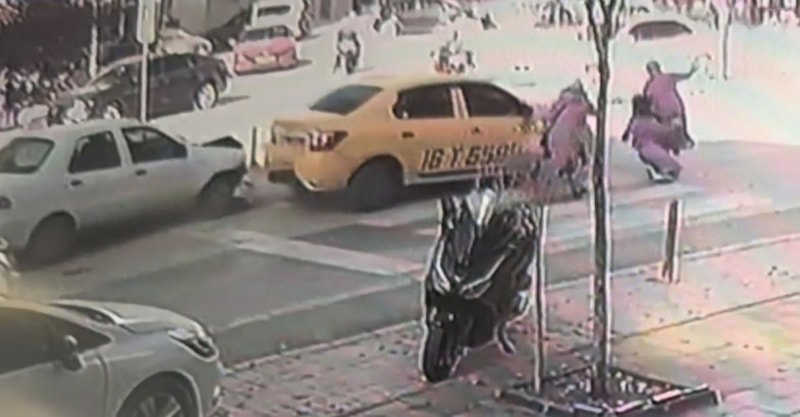 Güvenlik kameralarına yansıyan olayda, cadde üzerinde seyir halinde sürücü İlhan K. (36) yönetimindeki 16 T 5589 plakalı ticari taksi, yaya geçidinden geçen yayaları görünce durdu.