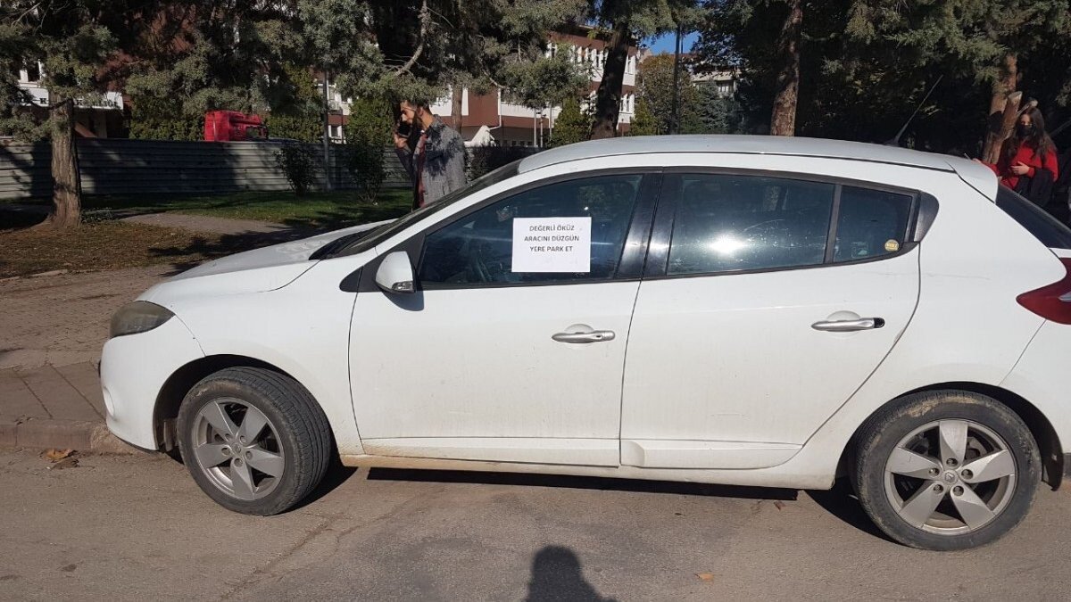 Kaldırımdan geçen yayalardan biri ise tepki olarak kağıt üzerine 'Değerli öküz, aracını düzgün yere park et' yazarak otomobilin camına astı.