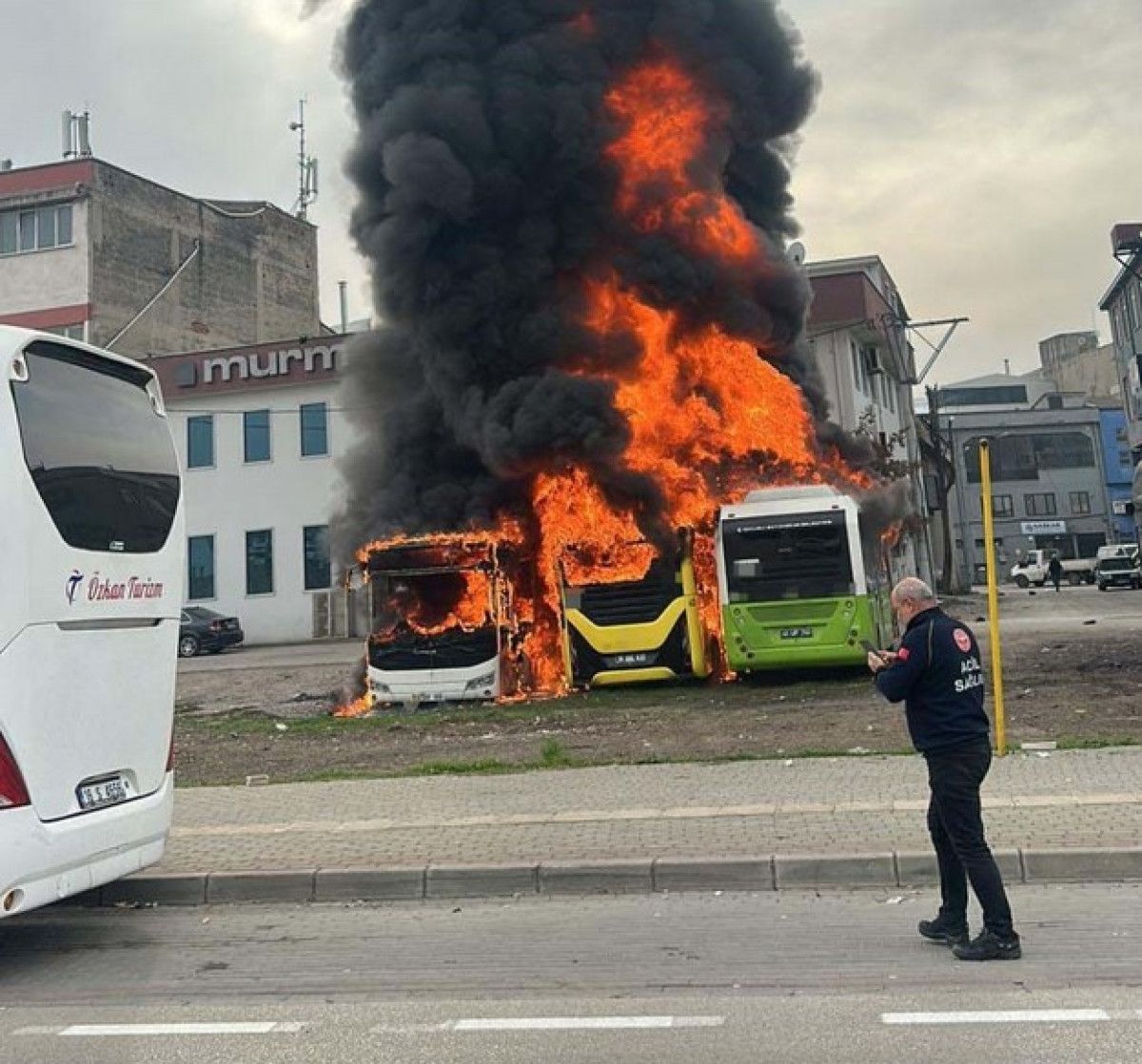 Bursa’nın Osmangazi ilçesi Küçükbalıklı Mahallesi’nde, bakıma bırakılan otobüslerin park halindeki alanında çıkan yangın kısa sürede büyüdü. Yan yana duran üç otobüs bir anda dumanla kaplanarak alev topuna döndü. Gökyüzünü kaplayan yoğun siyah duman, kentin birçok noktasından görüldü.