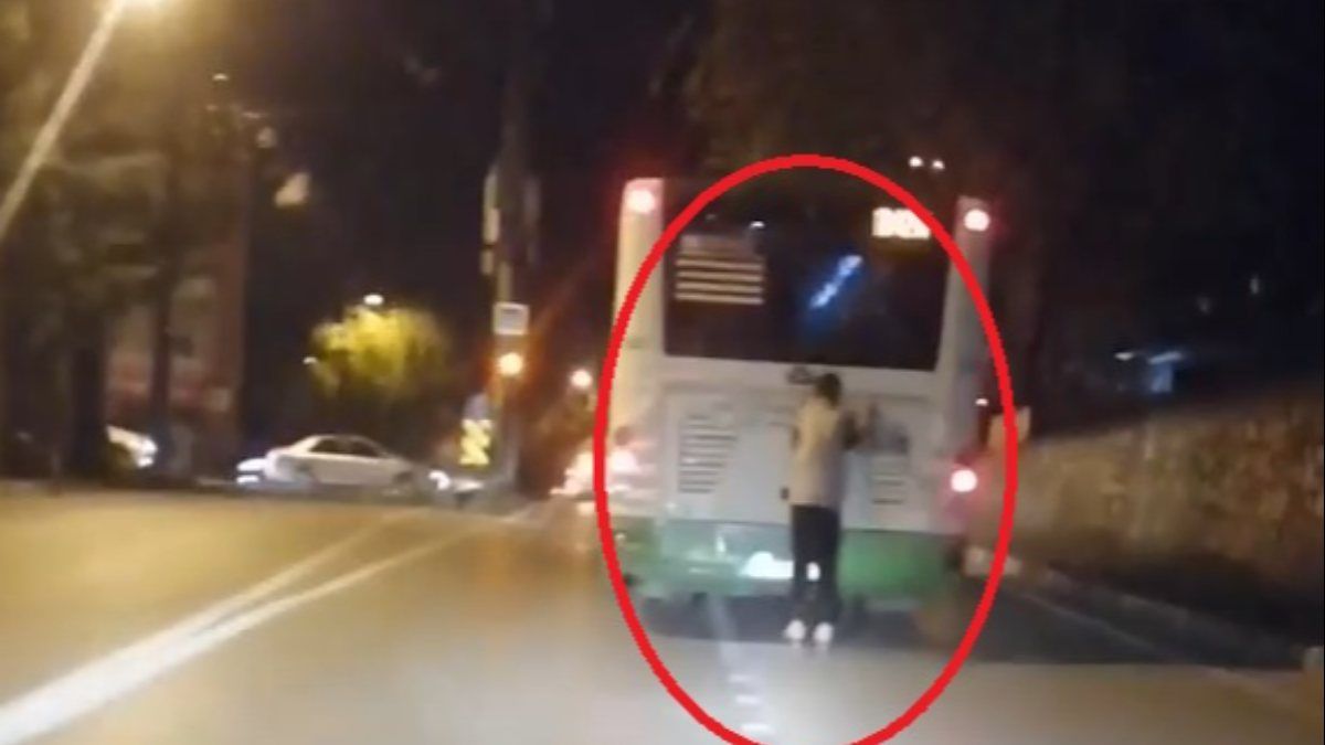 Bursa'nın Osmangazi ilçesi Dikkaldırım Caddesi’nde giden patenli genç, bir ara özel halk otobüsünün arkasına tutunarak, yolculuk etti.