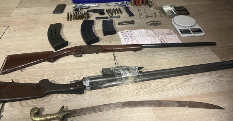 Savcılık kararı ile aranan ev, cephaneliği aratmazken, yapılan aramada ise 13 adet tarihi eser obje, 3 tabanca, 2 tüfek, çok sayıda fişek, uyarıcı ve uyuşturucu madde ele geçirildi.