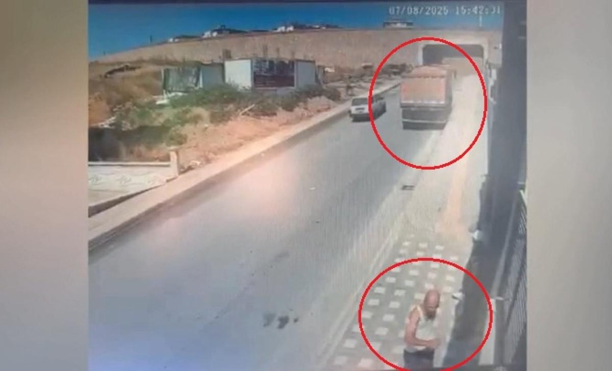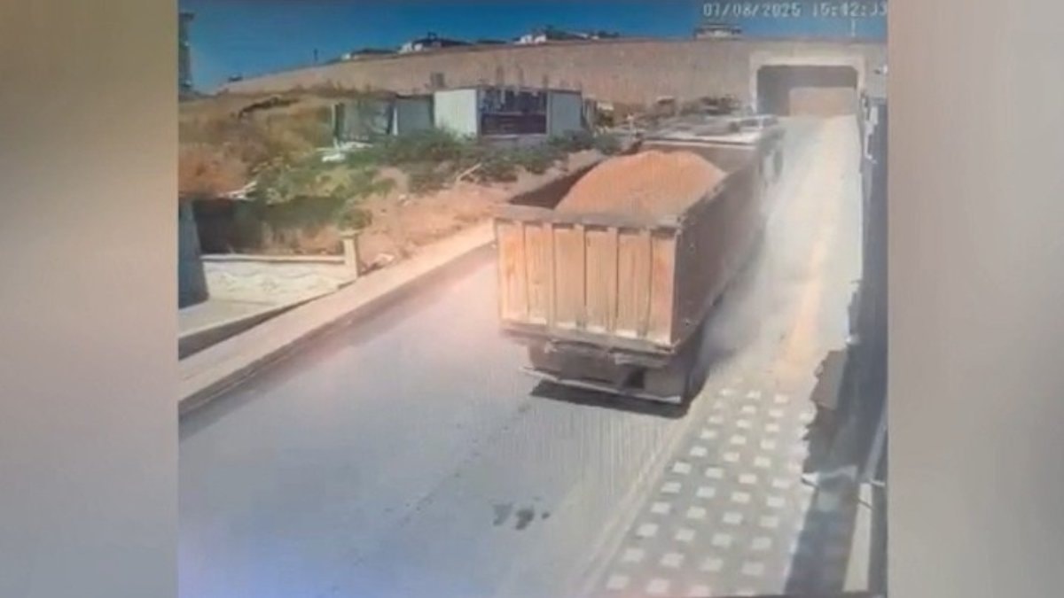 Kontrolden çıkan kamyon, bir sitenin bahçe duvarına çarparak devrildi. O anlar çevredeki güvenlik kamerasına yansırken, kaldırımda bulunan bir kişi kamyonu son anda fark ederek kaçarak ezilmekten kurtuldu.