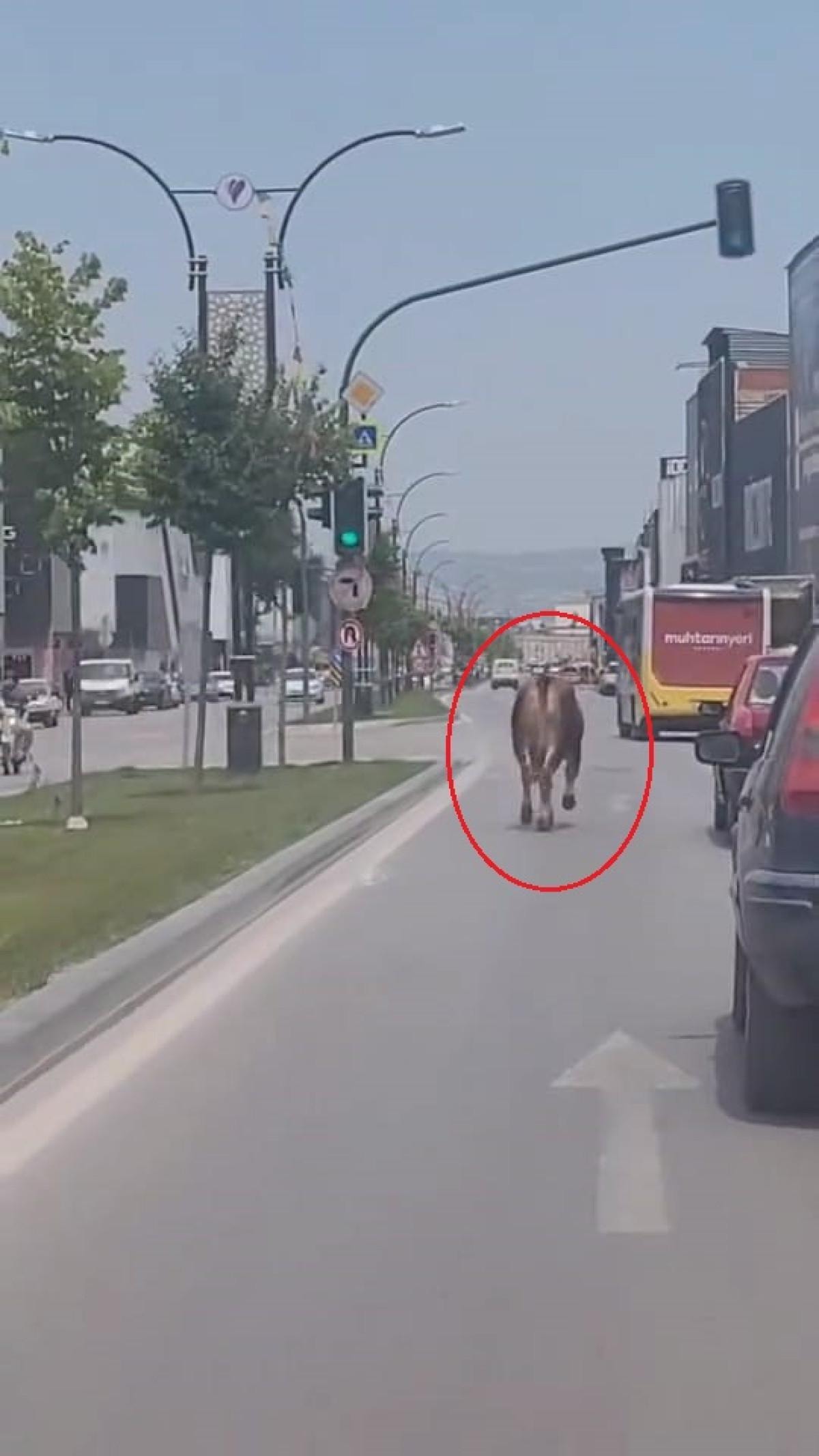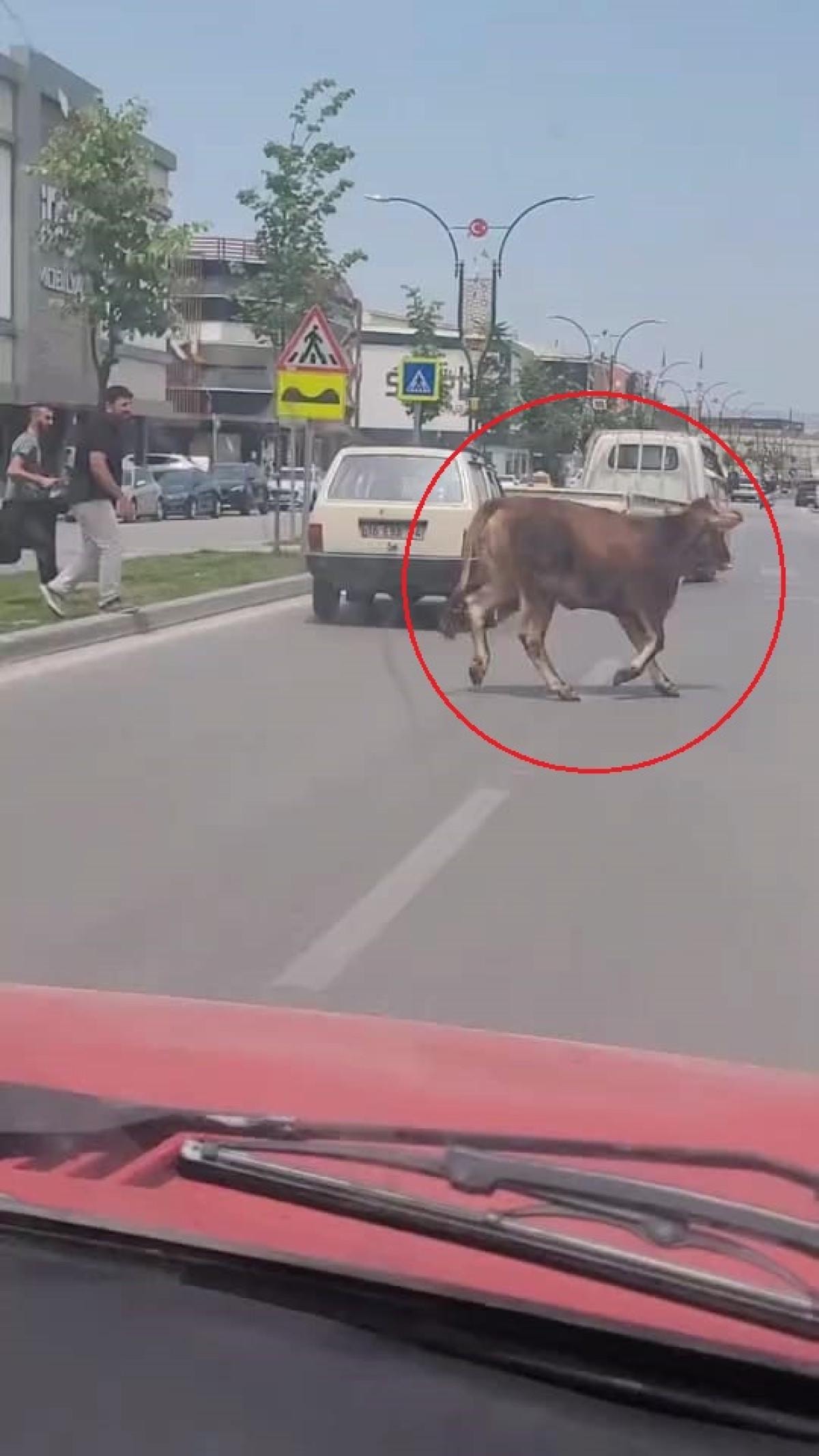 Kaldırımdan yola inerek, otomobillerin ortasında koşmaya başlayan inek, trafiği birbirine kattı. Sahibinin yakalamaya çalıştığı ineğin önü kamyonetle kesildi.