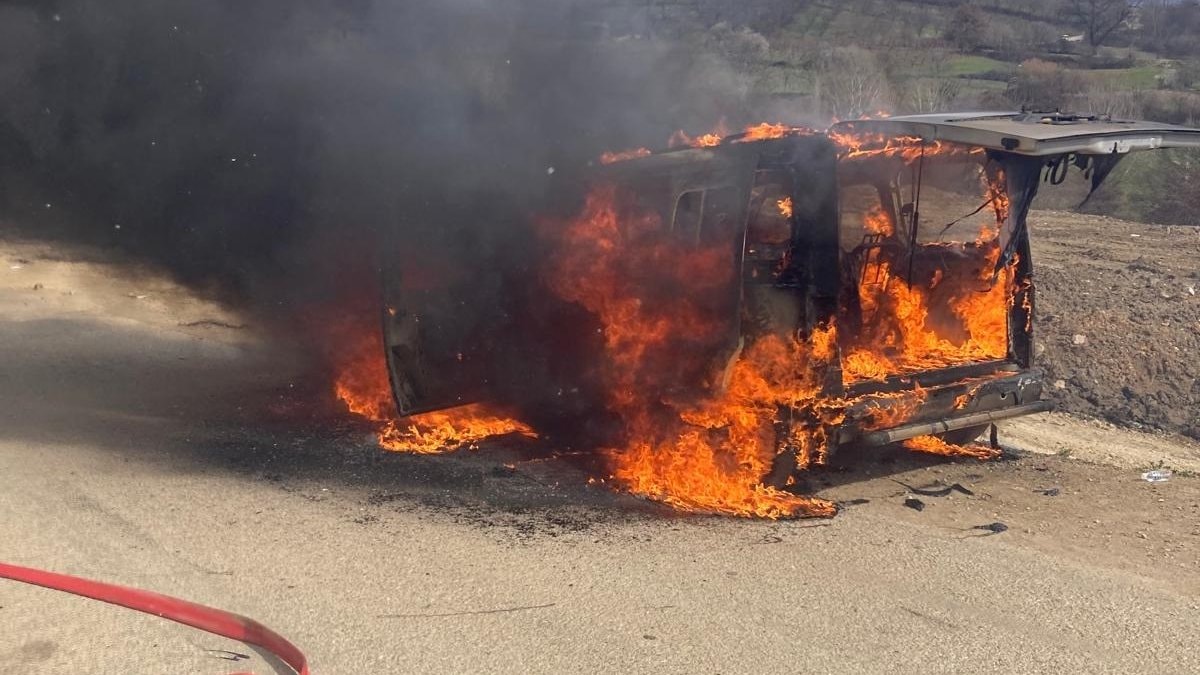 Bursa'nın İnegöl ilçesi kırsal İsaören Mahallesi Muhtarı İsmail Çıbukcu, Çayyaka Mahallesi'ne giderken kullandığı hafif ticari araç, motordaki arıza nedeniyle bir anda alev aldı.