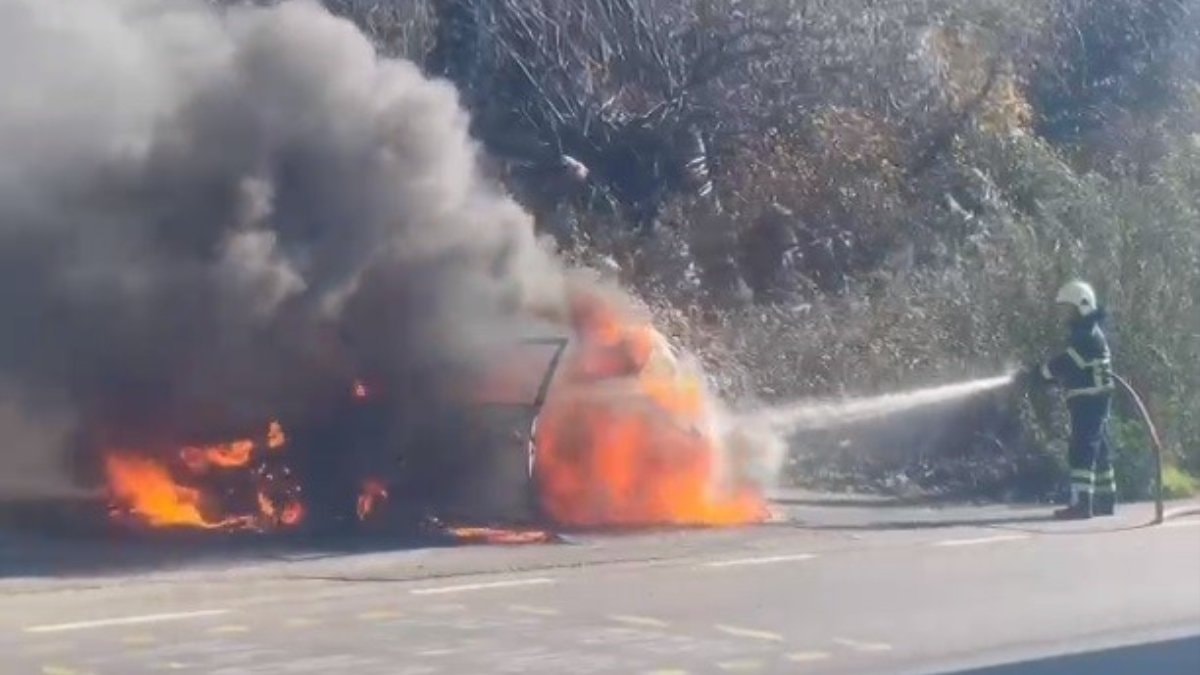 Alev alev yanan otomobil Mudanya ilçesinden gelen itfaiye ekipleri tarafından söndürüldü.