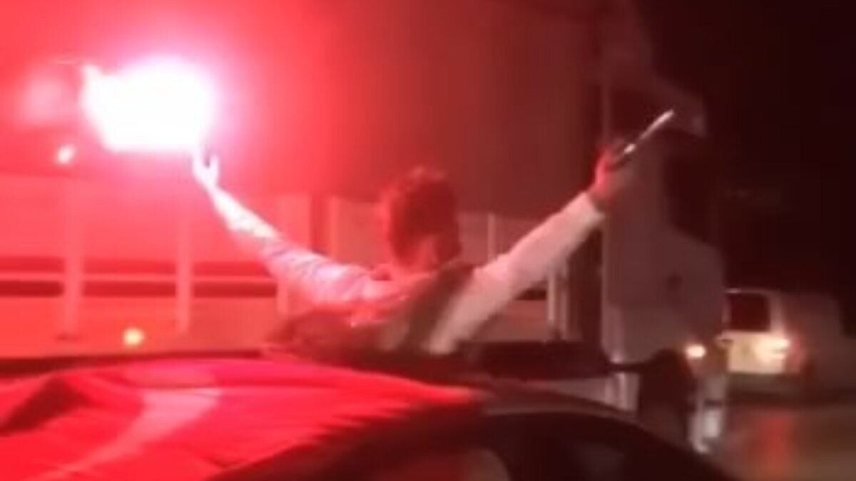 Konvoy grubunda olan gençlerden biri, seyir halinde giderken otomobilin içinden çıkardığı yarı otomatik silah ve tabancayı camdan dışarı çıkararak tehlikeye davetiye çıkardı.