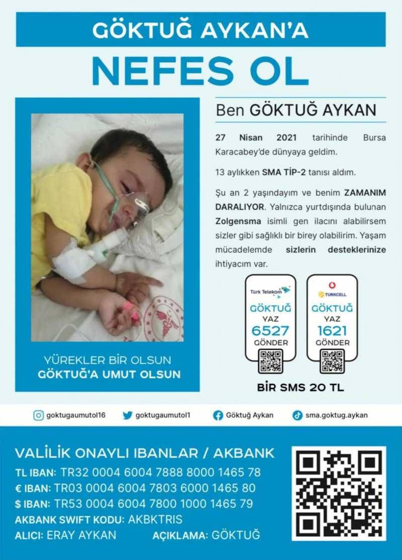 Bursa'nın Karacabey ilçesinde oturan Derya ve Eray Aykan çiftinin 3,5 yıl önce dünyaya gelen ilk çocukları Göktuğ'a 13 aylıkken Spinal Musküler Atrofi (SMA) Tip-2 tanısı koyuldu.