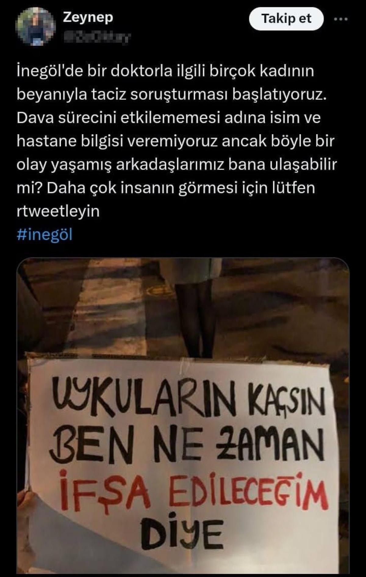 İnegöl Cumhuriyet Başsavcılığı, yapılan suç duyurusu ve sosyal medyada yer alan 'taciz' iddiasıyla ilgili doktor M.A.K. hakkında gözaltı kararı verdi.