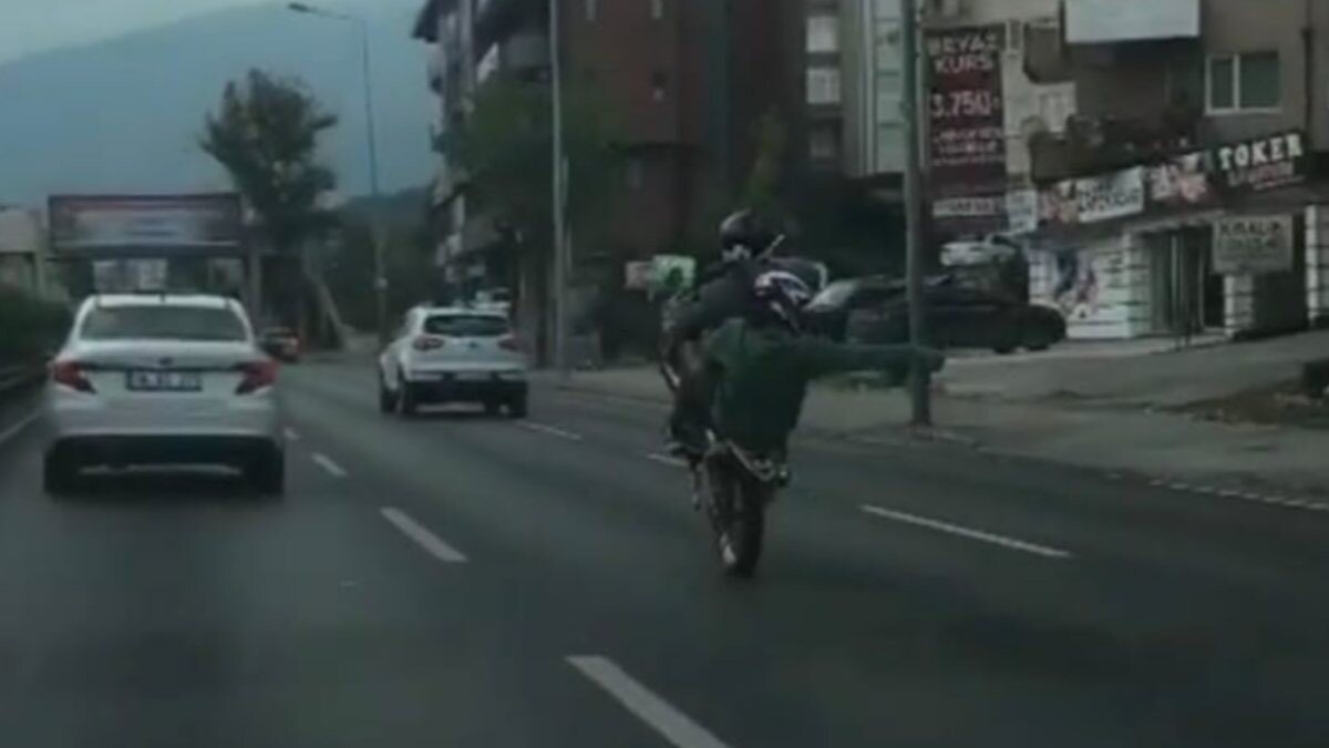 Kendisinin ve yanında bulunan arkadaşının canını hiçe sayarak motosikletini şahlandırıp tek teker üzerinde seyreden sürücü, sosyal medyada da binlerce kişinin tepkisi ile karşılaştı.