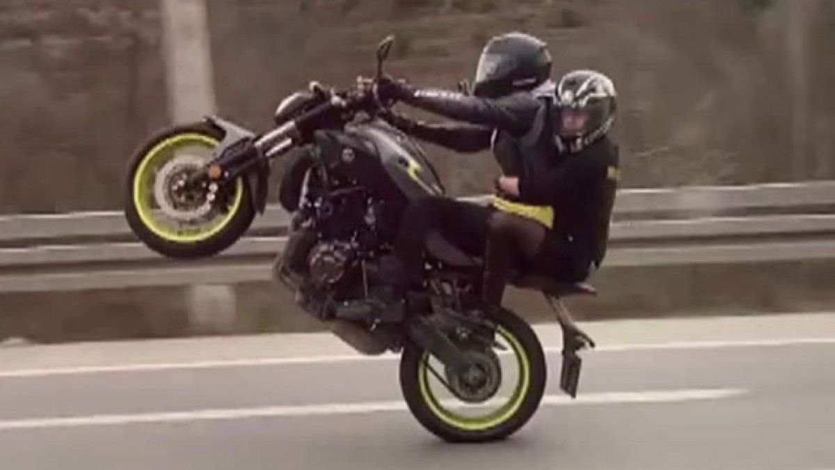Bursa’nın Mudanya ilçesinde arkasında oturan kişiyle seyahat eden sürücü, bir ara kullandığı motosikletin ön tekerleğini kaldırdı.