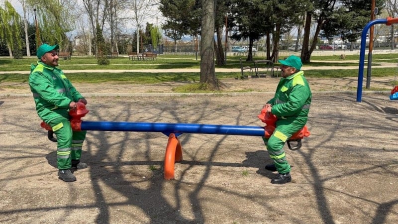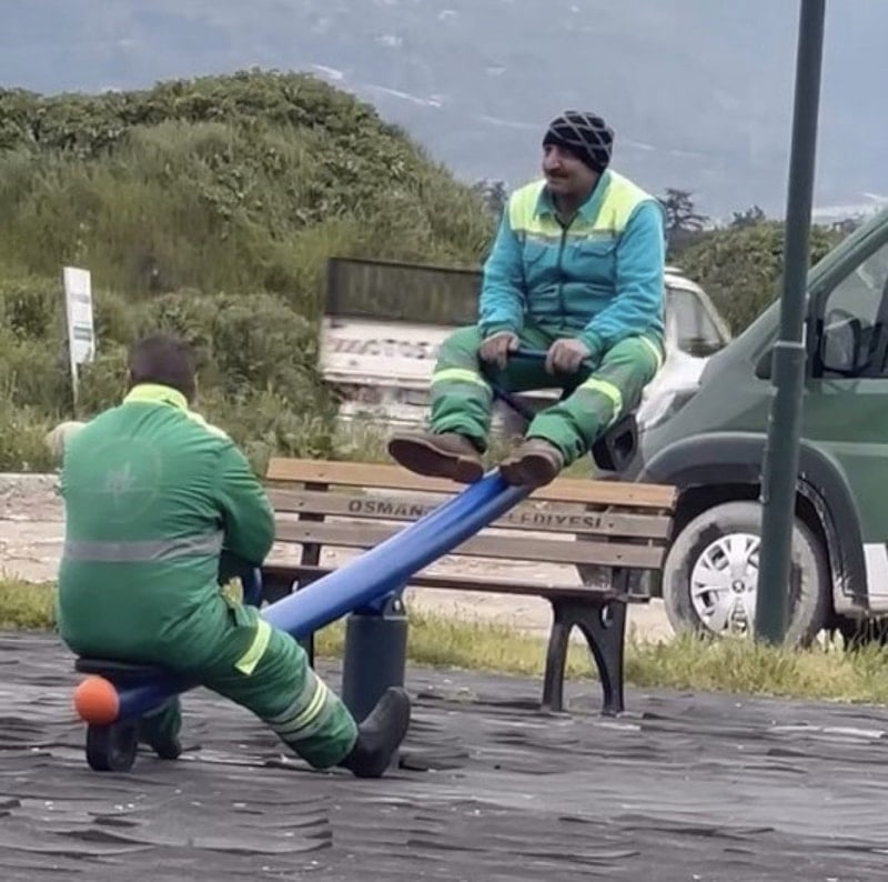 Osmangazi ilçesinde çocuk oyun parkını temizledikten sonra mola veren temizlik görevlilerinin tahterevalliyle dakikalarca eğlendiği anlar, cep telefonu kameralarına yansıdı.