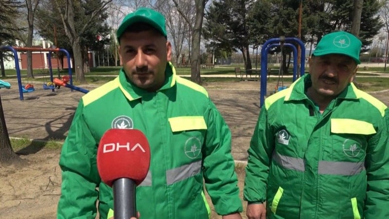 Bursa'nın Osmangazi Belediyesi Temizlik İşleri Müdürlüğü’nde görevli Enes Akbulut ile Gülamir Taş (48), görev sahalarındaki Yunuseli Mahallesi'nde çocuk oyun parkını temizledikten sonra mola verdi.
