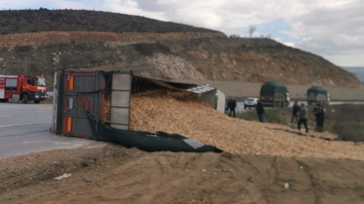 Bursa'nın İnegöl ilçesinde Mobilya İhtisas Organize sanayi bölgesinden iniş yapan sürücü O.N. (36) yönetimindeki 43 HP 827 plakalı talaş yüklü tır, kavşaktan dönüş yaptığı sırada kontrolden çıktı.
