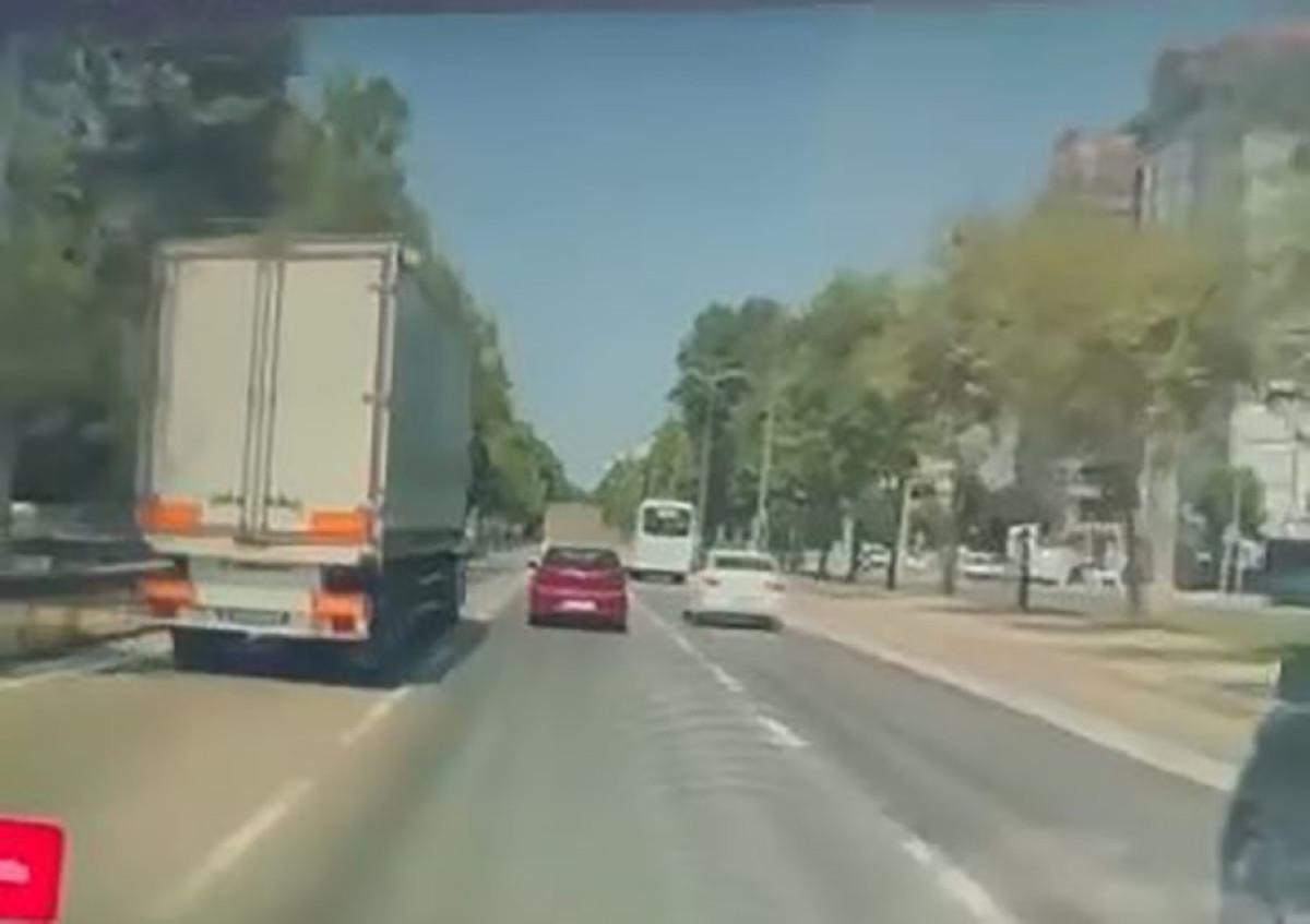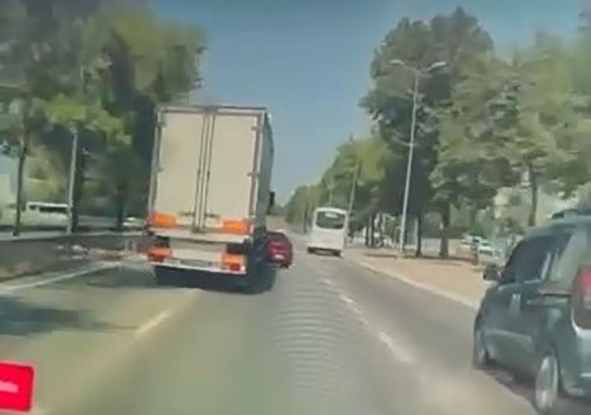 Direksiyonu sağa kırmasıyla birlikte kırmızı araç, tırın önünü yan dönerek sürüklenmeye başladı.