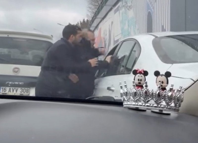 Otomobil sürücüsünün camını açması ile 2 kişi, araç içine doğru yumruk savurdu.