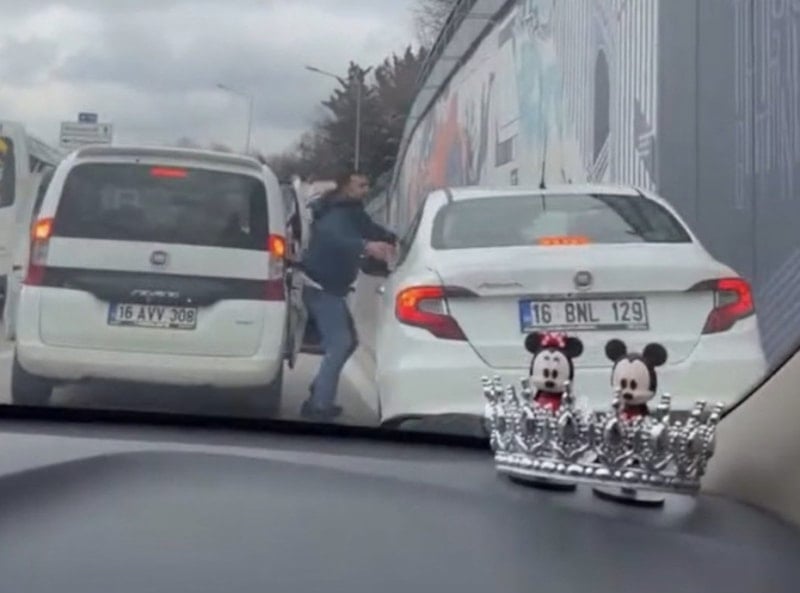 Sürücü, hafif ticari aracı ile otomobilin önünü kesti, ardından aşağı inip, yanındaki 2 kişi ile otomobil sürücüne yöneldi.