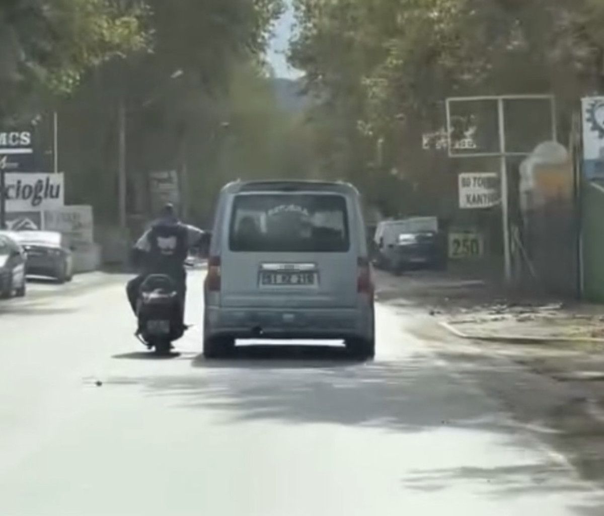 Sohbete dalan sürücü, bir kolunu araca yaslayıp diğer eliyle motosikleti sürmeye devam etti.