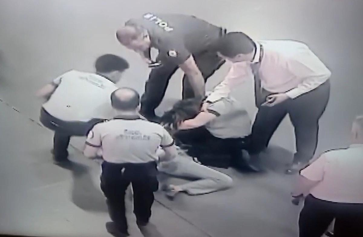 Görevliler daha ne olduğunu bile anlamadan küfretmeye başlayan H.G., kendisini sakinleştirmeye çalışan kadın güvenlik görevlisi F.Y.'ye saldırınca iki kadın yere düştü.