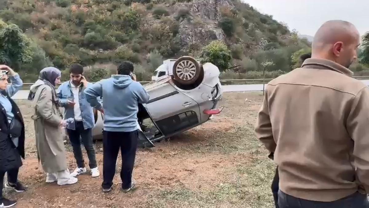 Yağışlı havanın etkisiyle savrulan araç, orta refüje çarpıp takla attı.