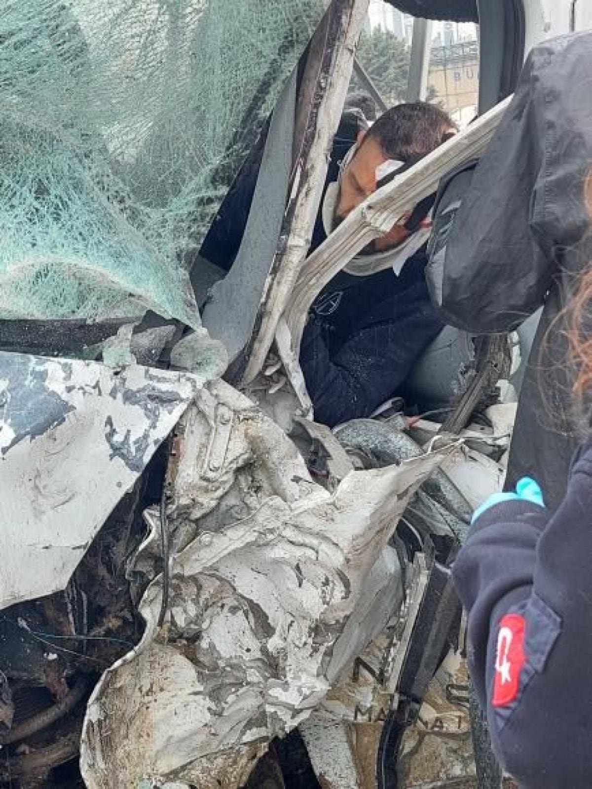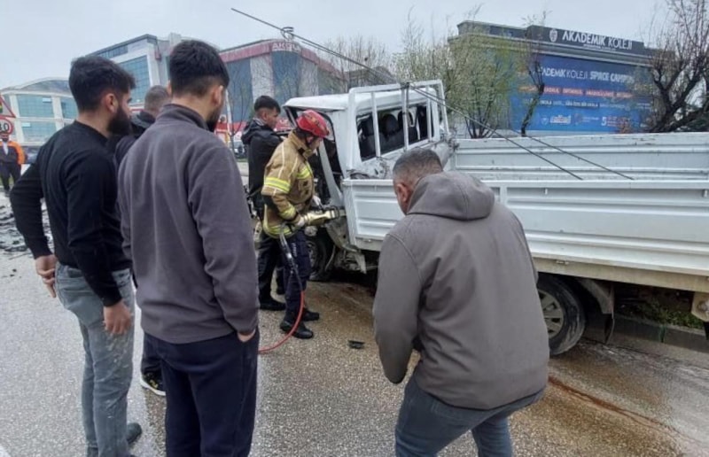 Direksiyon başında sıkışıp ağır yaralanan kamyonet sürücüsü itfaiye ekiplerince çıkartılıp hastaneye kaldırıldı.
