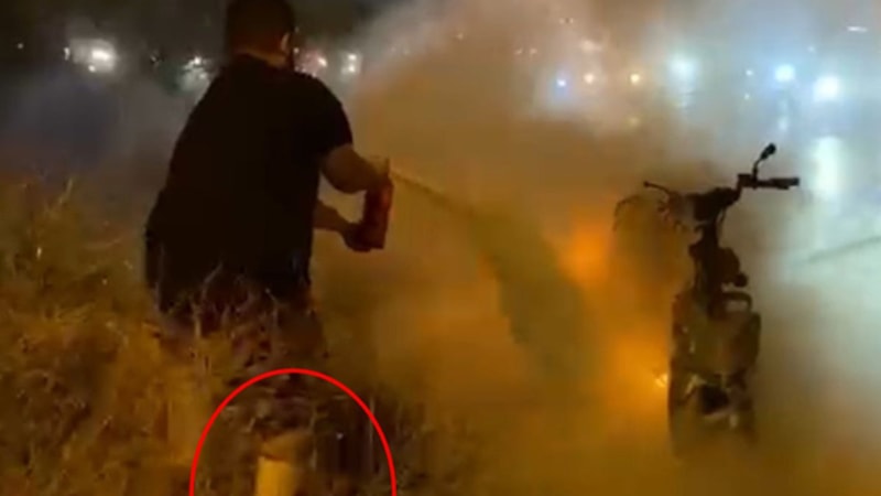 Ayağında alçıyla motosiklete koşan vatandaş, elindeki yangın tüpüyle alevlere müdahale etti.