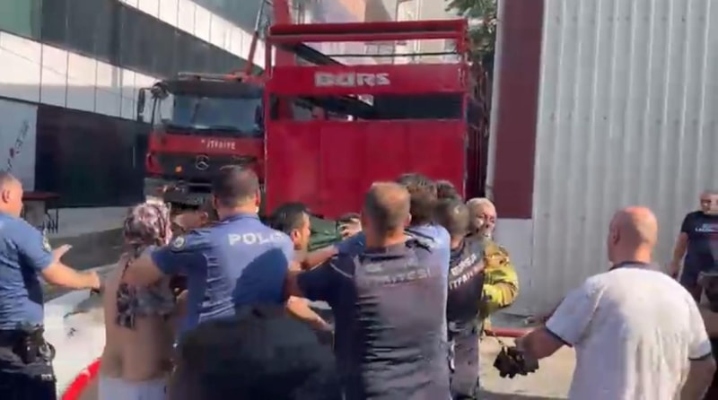 Tekstil atölyesindeki yangına müdahale sırasında, itfaiye ekipleriyle iş yeri çalışanları arasında, "alanı boşaltın" uyarısı üzerine arbede yaşandı.