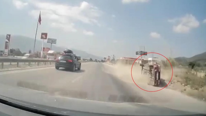 Bursa'da yanından hızla geçen hafif ticari araçtan kaçmak için sürücüsünün ani manevra yaptığı otomobilin yol kenarına savrulup devrildiği anlar başka bir aracın kamerasına yansıdı.