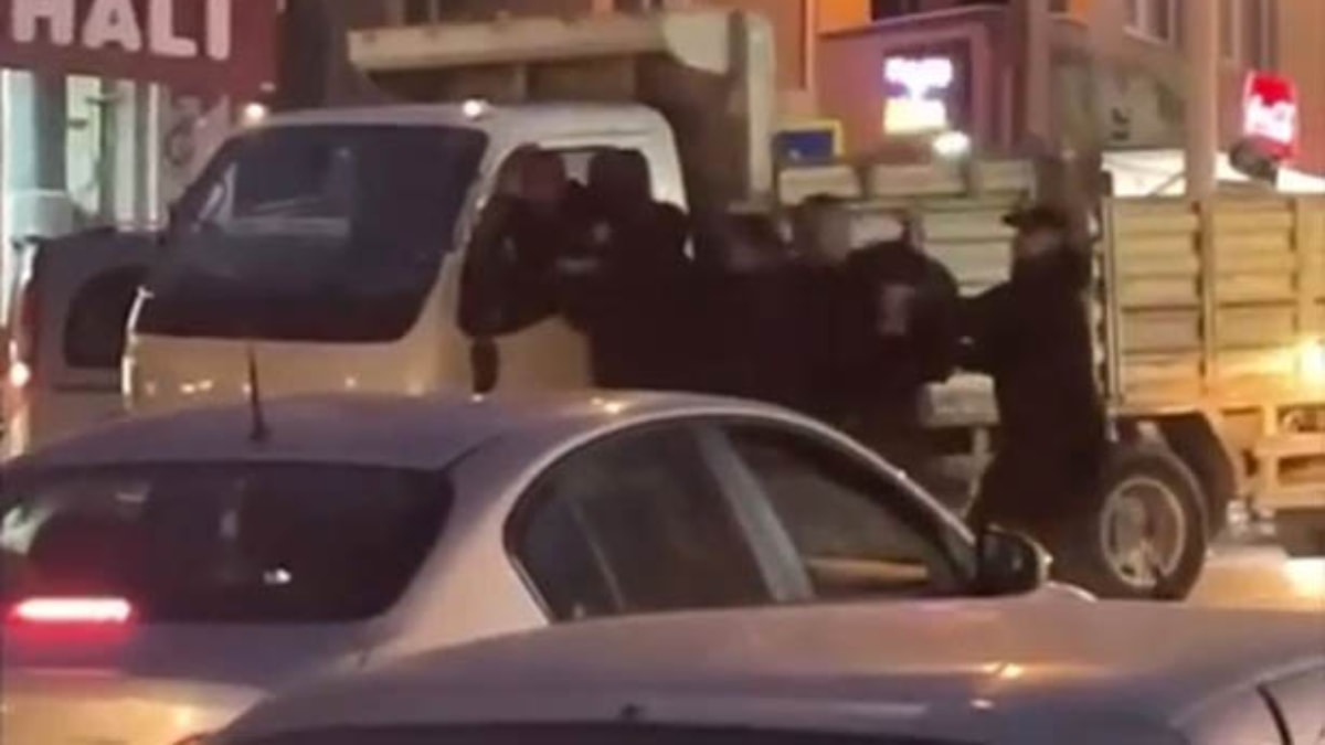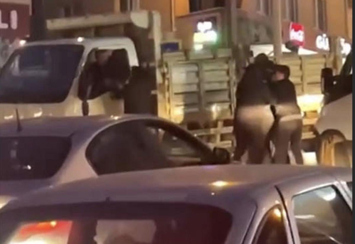 Kamyon sürücüsü araç içinde darp eden tarafları, trafikteki diğer sürücüler güçlükle ayırırken, caddenin ringe döndüğü anlar vatandaşların kamerasına yansıdı.