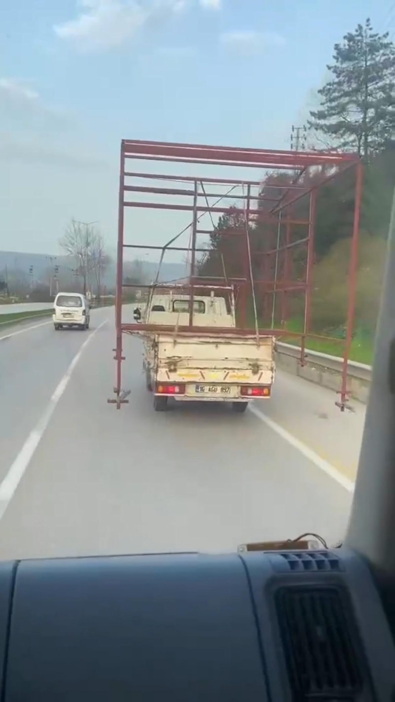 Bursa'nın Kestel ilçesinde, Ankara Bulvarı Barakfakih Mevkisi'nden, kent merkezine giden 16 AGU 897 plakalı kamyonetin kasasında, önlem alınmadan taşınan çelik kulübe iskeleti sürücüleri tedirgin etti.