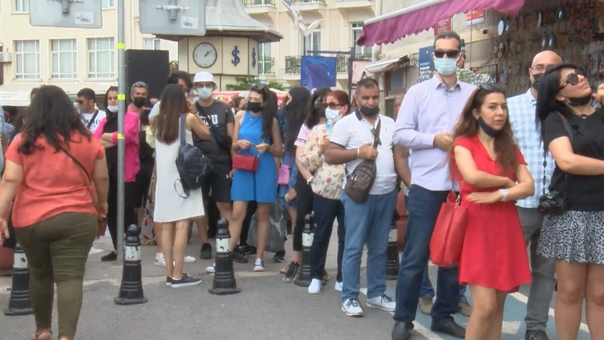 Büyükada Saat Kulesi'ne kadar uzanan kuyruk sırasında bazı vatandaşların sosyal mesafe kuralına uymadığı gözlendi.